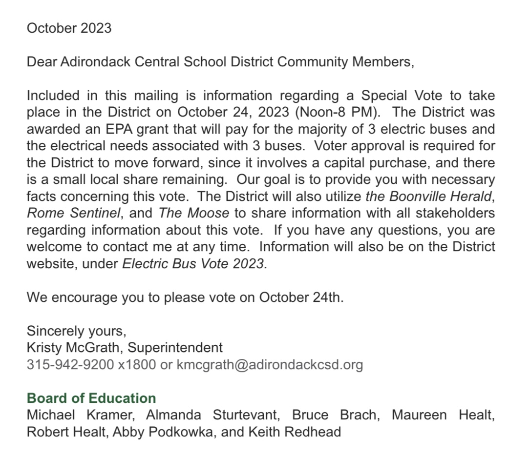 Interview: Adirondack School Superintendent Kristy McGrath and BOE President Mike Kramer talk upcoming district vote on October 24 for EPA grant to help cover first group of electric school buses