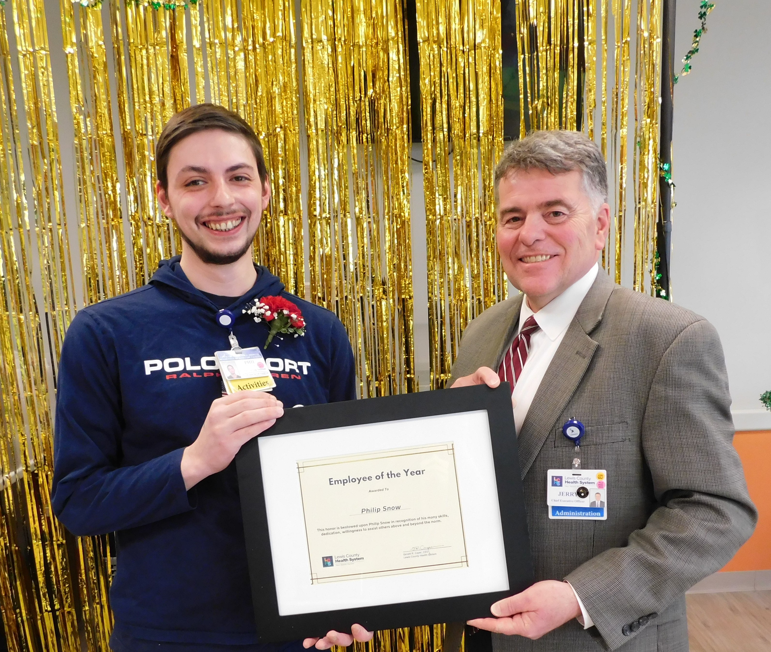Image via Lewis County Health System: Activities Aide, Philip Snow accepting the Employee of the Year award from LCHS Chief Executive Officer Gerald R. Cayer.